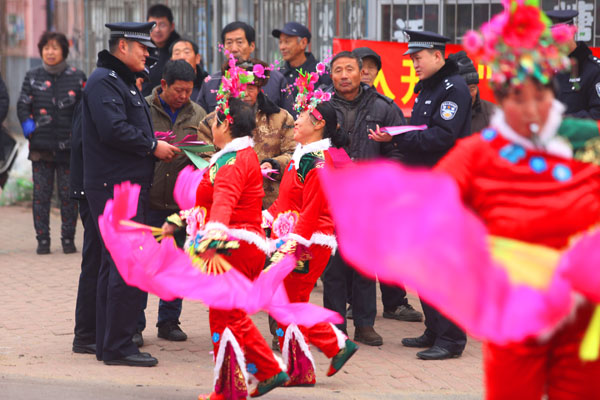 12月24日,东港市公安局新农派出所组织“大秧歌法制服务队”在辖区开展涉危、涉爆、消防等宣传活动,使广大群众增强安全和守法的意识。