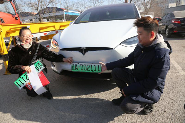 本报讯 12月25日,沈阳市全面启用新能源汽车专用号牌。当日11时20分,沈阳第一位新能源号牌车主王女士手持“辽AD02111”的号牌激动不已,“能拍到三连号,还成为全市首个,真是太幸运了!”
