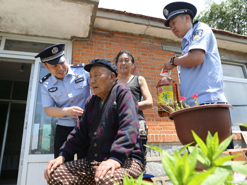 7月4日,丹东边境管理支队前阳边境派出所民警带着米、面、豆油等生活用品,来到丹东市振兴区江海街道胜利村,走访慰问有着70年党龄、现年91岁的老兵于福金,聆听老人讲述当年战斗中的感人故事。
