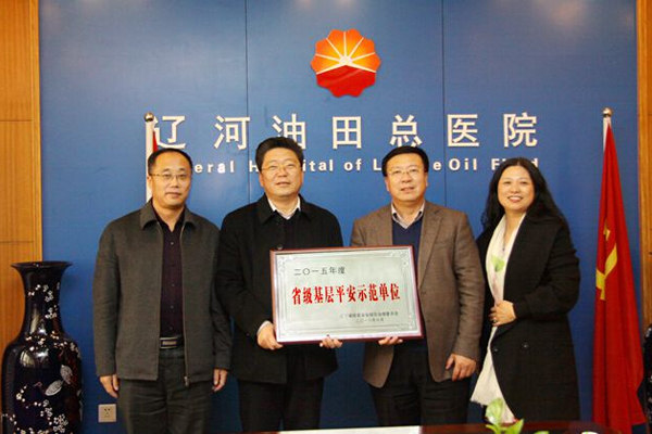 辽河油田政法委常务副书记蓝子天(右二)为总医院颁发牌匾