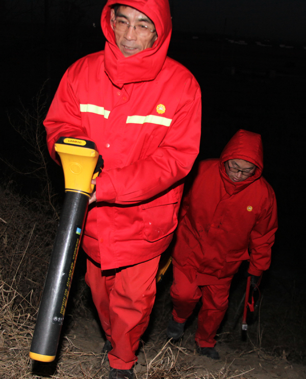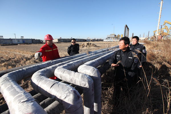 欢喜岭采油厂保卫科人员在查看井场油气管线